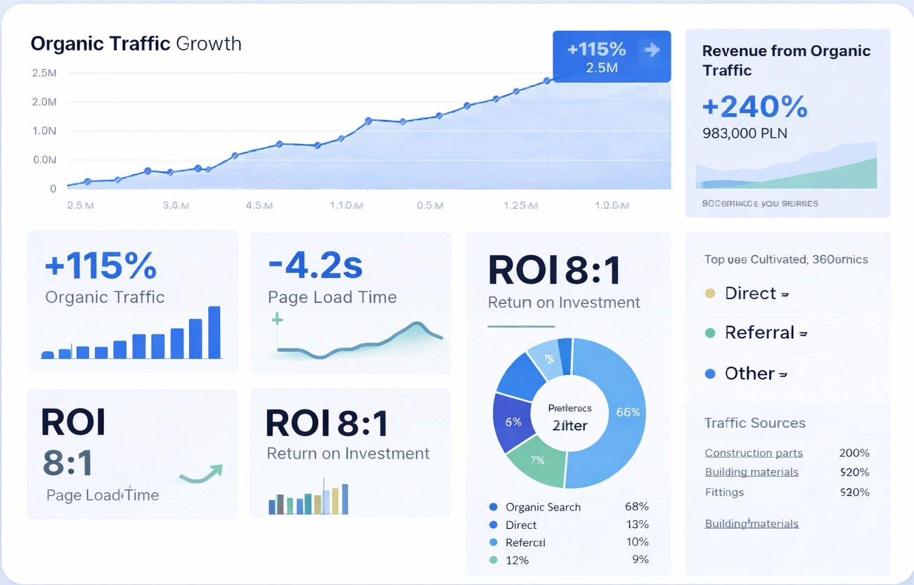 Dla lidera branży budowlanej przeprowadziliśmy migrację na autorski silnik SEO-ready oraz zautomatyzowaliśmy synchronizację danych z systemem ERP. Wynikiem była eliminacja błędów 404 i błyskawiczna indeksacja 50,000 nowych produktów.